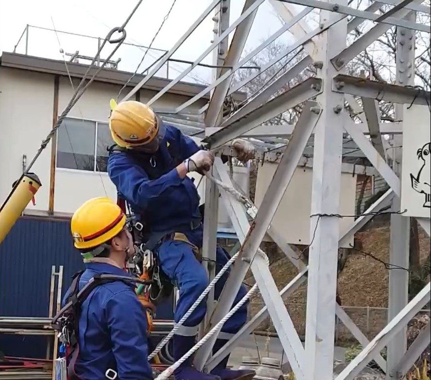 高所作業では、必ず命綱がつくよう様々な安全装備を使用し作業を実施します。